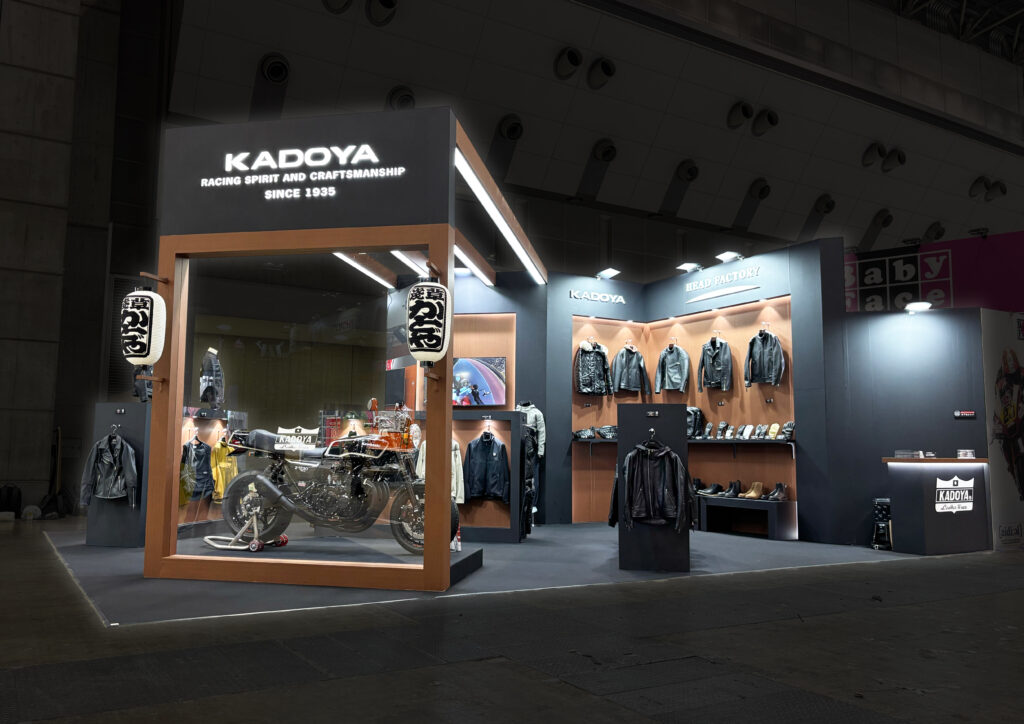 歴史のあるKADOYA様の世界観と製品を最大に引き立たせる空間をご提案いたしました。黒と木目を基調とした上質な雰囲気の中で、革製品を効果的に訴求し、多くのバイカーの注目を集めました。